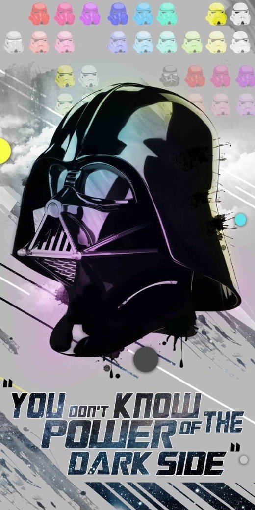 Esta imagen nos recuerda el clásico póster callejero, ese que se pega con engrudo y rapidez en las esquinas más transitadas de la ciudad. Ostenta el clásico fondo japonés (ese del sol naciente) y gracias a su paleta cromática de rojo y negro, crea un póster de Darth Vader «impresionante», tal cual cierra su frase final.