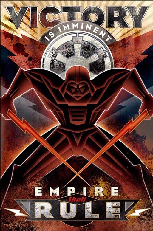 Este póster de Darth Vader me recuerda al estilo gráfico de la película Metrópolis. Es un afiche de propaganda que pregona la pronta victoria del Imperio contra los Rebeldes. «El imperio debe gobernar», reza al final de la imagen. Notable.