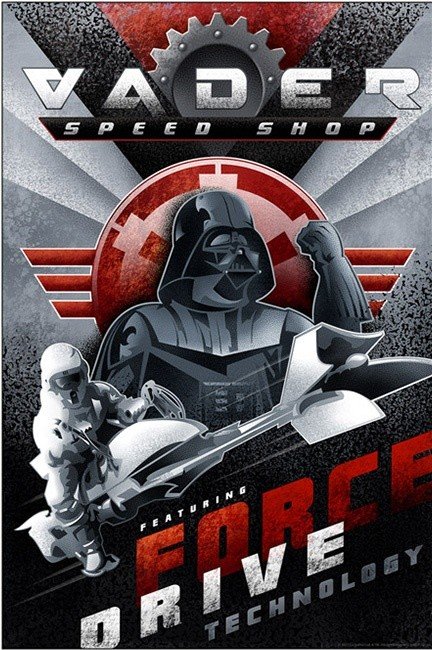 Este afiche emula la publicidad de un taller mecánico de speeders de Star Wars o algo similar (un Speed Shop), lo cual es cool, pero rebaja al poderoso Vader a la categoría de mecánico. No es que tenga algo de malo ser mecánico, es solo que el aspirante a Emperador del Universo merece mejor suerte que ser el rostro publicitario de un taller mecánico. Pero bueno, ya sabemos como es la publicidad.