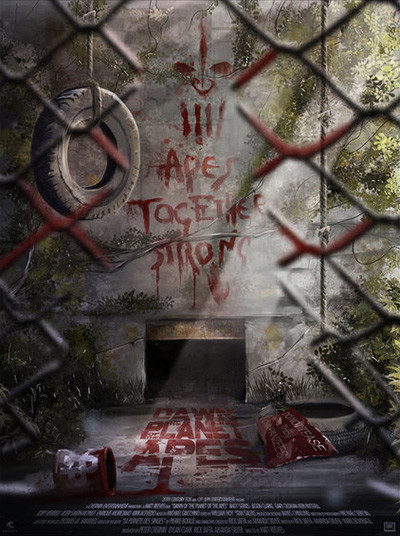 En este caso, el afiche de cine original tiene un problema grave: sobrepoblación. Está bien, puedes tener simios a caballo, también puedes tener simios con espadas, M-16 o incluso con lanza misiles, y por qué no, simios quemando el Golden Gate y colgando de los cables en llamas, ¿pero todos juntos?, es como esta oración, sin ningún punto que separe las ideas, apenas unas comas todas tacañas y un par de signos de interrogación, y por lo tanto, es una agotadora frase para leer. En su contraparte, el fanArt es simple, claro y realmente amenazador. ¿Está escrito con sangre humana? ¿Es una amenaza? ¿Dónde están los simios?