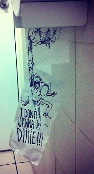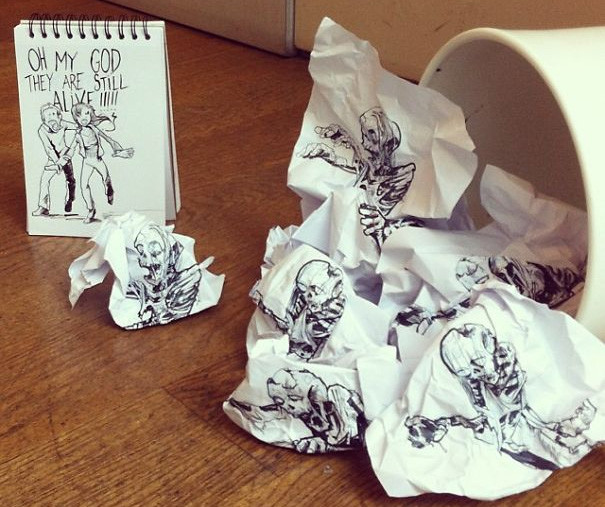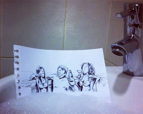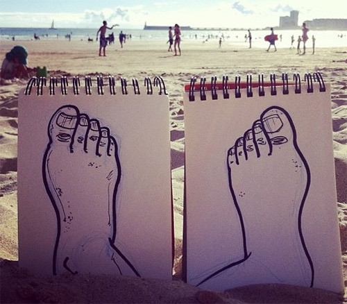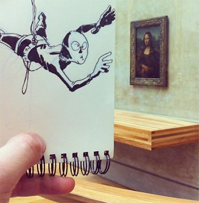 Troqman es un dibujante holandés que también mezcla ilustración con realidad, pero su trabajo posee un humor más irónico y cotidiano, además de usar sus croqueras como soporte para invadir la realidad.