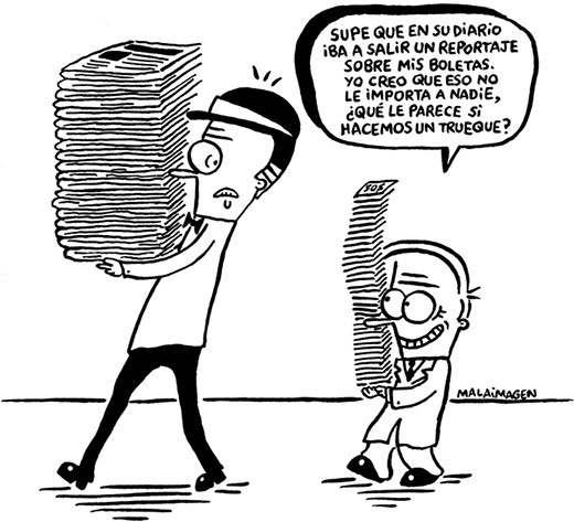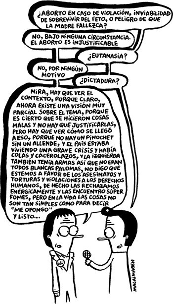 Yo empecé publicar el 2007, pero no publicaba necesariamente humor político; si ven los dibujos en mi blog y ponen el año 2007, van a ver unos dibujos totalmente distintos a lo que hago ahora, y que yo les tengo mucho cariño pero eran bien feos en realidad, ahora mirándolo objetivamente… Pero yo siempre tuve un interés en cosas sociales y de a poco fui introduciendo eso en los dibujos. No con la constancia con la que lo hago ahora, sino que gradualmente. A mí siempre me han interesado desde chico los temas que tenían que ver con problemática social, pero no como una cosa de, de… Uhm… A ver, una vez me dijeron “oye ahora ‘tai haciendo humor político porque está de moda” y, oye, no es que esté de moda el interés de la gente en estos temas. Yo desde muy chico iba a las protestas contra el servicio militar por ejemplo, iba a actividades relacionadas con la música y tenía ese interés siempre. Y cuando empecé a meterlo en los dibujos fue de una forma medio fortuita porque teníamos un presidente que, no sé si se acuerdan ustedes, era un poco chascarriento [y las risas no se hacen esperar], que era el presidente Sebastián Piñera, al cual yo le tengo mucha gratitud ya que gracias a él estoy donde estoy [sonríe malicioso]. Y bueno, por supuesto a hacer campaña para que salga de nuevo… Ya, entonces, cuando yo empecé a trabajar con contingencia, no era necesariamente política sino cosas que yo veía día a día, ahí empecé a hacer chistes. Me acuerdo que en el mundial de fútbol empecé, chistes que no conoce nadie, que a nadie le importaron, pero ahí yo me di cuenta que me gustaba mucho hacer humor con cosas que pasaban al día a día… Y Piñera, como que se robaba la película porque era tan pintamonos que todo los días se mandaba un chascarro nuevo y yo hacía un dibujo, entonces de a poco me fui metiendo en el tema y después cuando me puse a hacer las parodias de Tolerancia Cero, ahí ya estaba de cabeza en el humor gráfico político, y es un humor que a mí me gusta mucho a mi y que igual es una responsabilidad grande porque Chile tiene muchos dibujantes buenos de humor político, desde hace mucho tiempo, hace muchos años, entonces meterme en ese rubro ha sido una responsabilidad y algo que me tiene bien contento porque a mí, a mí, me gusta mucho.