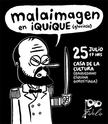 25 de Julio, Iquique; ubicada en el paseo Baquedano, la Casa de la Cultura abre sus puertas para los asistentes al conversatorio organizado por @Fidelio, quienes –junto con dar chequeo a la lista de invitados- dan regalos de bienvenida a los asistentes. En la terraza del tercer piso, té y café dan compañía a quienes buscan un asiento esperando que Guillermo Galindo, dibujante conocido como Malaimagen, suba al escenario.