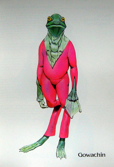Remitiéndonos sólo al aspecto físico la Guía en su mayor parte incluye alienígenas tanto o más originales que los titerotes, pero también algunos tan “facilistas” cómo los Kzinti (no estamos poniendo en el banquillo las preciosas ilustraciones de Barlowe por supuesto, sino la flojera creativa de los autores). Cómo lograron estos personajes burlar la severa selección de Barlowe y Summers es un misterio pero ahí están, el Salaman de Brian M. Stableford (alienígena-salamandra), el Gowachin de Frank Herbert (alienígena-rana), el Dilbian de Gordon R. Dickson (alienígena-oso) y el Old Galactic de James H. Schmitz (alienígena-babosa). Estos serían los más deficientes en cuanto a su concepción respecta, No podemos decir lo mismo de la Nube Negra de Fred Hoyle, la Madre de Philip J.