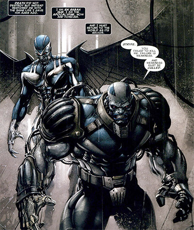 Apocalipsis nació con habilidades mutantes que fueron incrementadas al fusionarse con la tecnología de Los Celestiales. Gracias a estos poderes, tiene control total sobre las moléculas de su cuerpo, lo que le permite alterar la forma, consistencia, densidad y tamaño de su cuerpo, mejorar sus capacidades físicas y transformar sus extremidades en armas, alas o lo que desee.