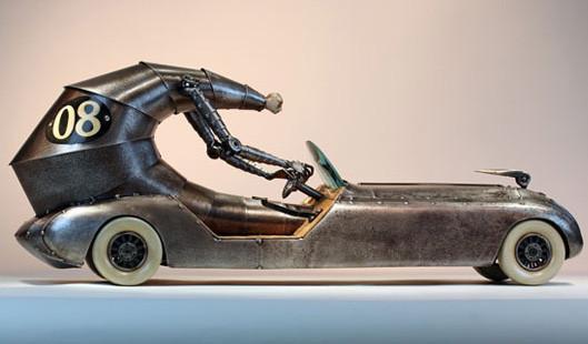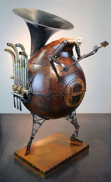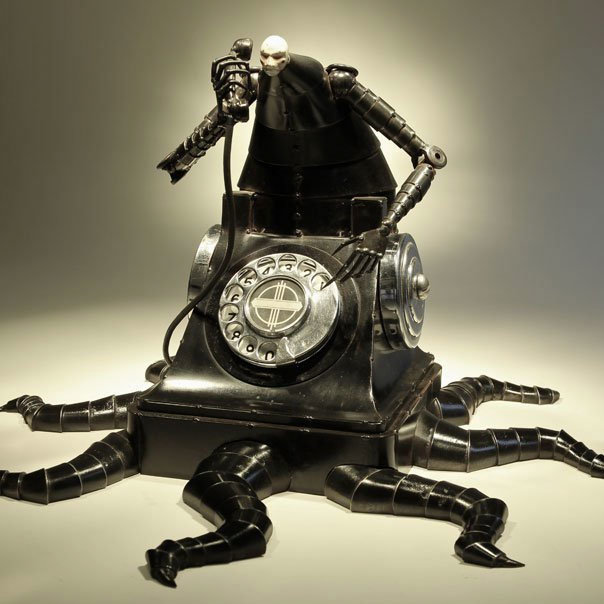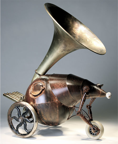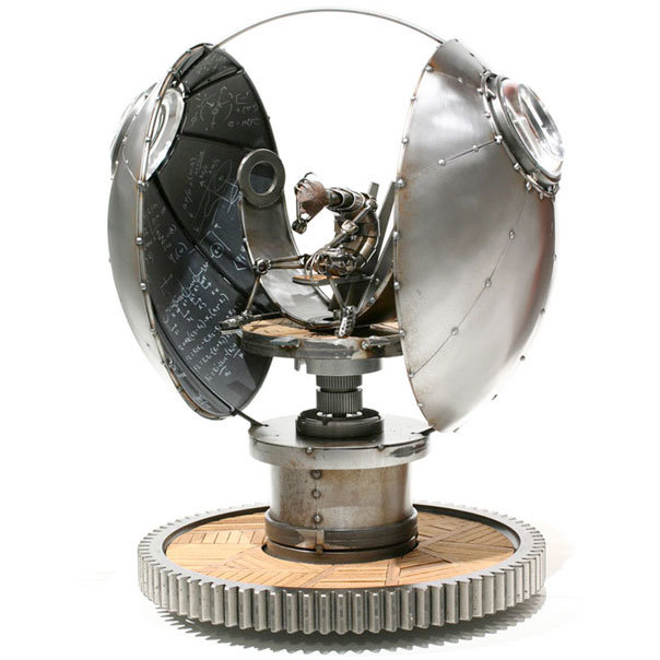 Con un poco de la chatarra que levanta de su vida, más acero, madera, vidrio y concreto, Greg Brotherton crea estas hermosas esculturas, aparatos biomecánicos inspirados por una visión distópica y política de inicios del siglo 20. Son representaciones de una revolución industrial que crea un mundo solitario y aislado, donde hombres y máquinas se funden en un abrazo eterno.