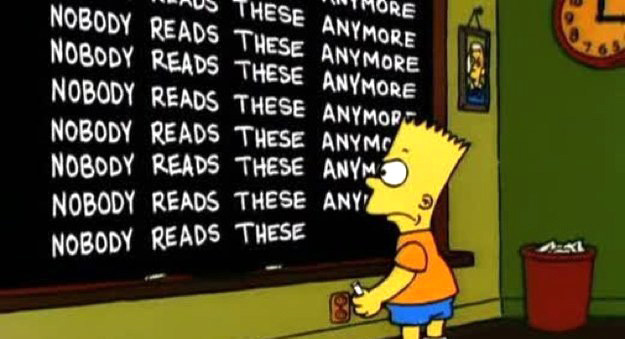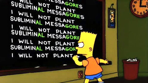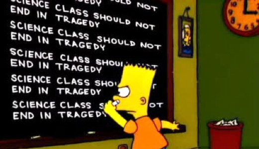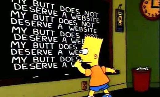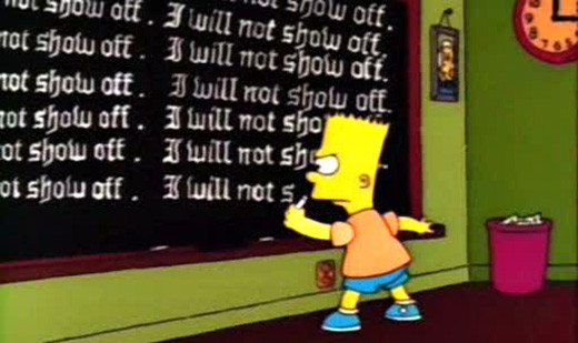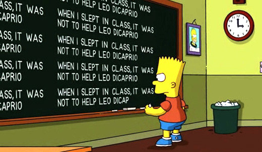 Han notado que cuando Bart se queda castigado en el colegio, escribe en el pizarrón de su curso una frase distinta cada vez (no sé para qué pregunto, es obvio que lo han visto). Estas oraciones versan sobre todo tipo de cosas, a veces expresan la razón del castigo de Bart, otras tienen mensajes políticos, ecológicos, sarcasmos a la sociedad norteamericana y en realidad hablan de todo, porque la gracia de esos 2 segundos de literatura animada es exactamente eso: tienes solo 2 segundos para leer el pizarrón. Pero eso se acabó, porque yo las detuve en el tiempo y la puse en esta entrada.