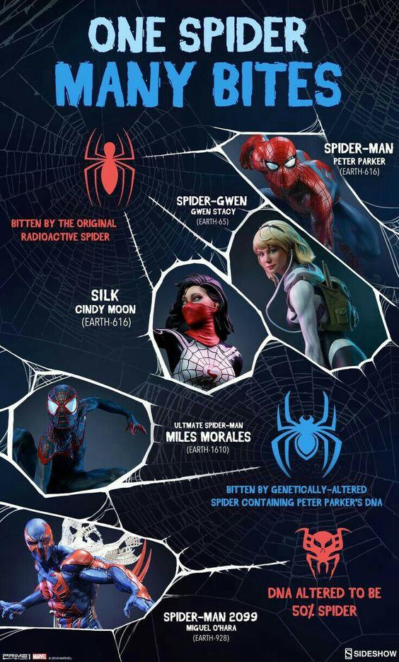 Además de Parker, existen múltiples versiones de Spider-Man cuyos orígenes se remontan a diferentes líneas cronológicas, universos alternativos u otros intérpretes. Aquí caen Miguel O’Hara, un genetista que sufre una mutación en su intento por replicar las habilidades del hombre araña, Miles Morales, un joven de trece años de edad descendiente de un padre afroestadounidense y de una madre puertorriqueña que obtiene sus poderes arácnidos, de manera similar a Peter, tras ser mordido por una araña con el código genético de este último y Gwen Stacy, que adquiere el perfil de Spider-Woman en el denominado Spider-Verse, una dimensión alternativa a los acontecimientos principales de The Amazing Spider-Man. En estas otras variantes de Spider-Man en el multiverso existen casos como Spider-Ham, o el Escorpión y Octopus en el papel del héroe arácnido.