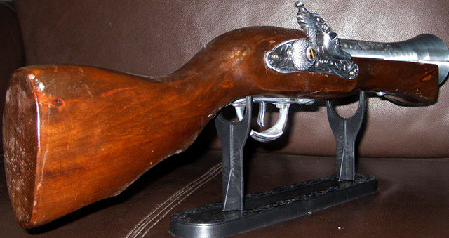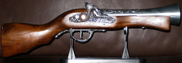 Este encendedor es una réplica de un pistolón antiguo. Al cargar la llave de rueda, prende la llama. Elaborada en madera y metal. Mide +40 cms. de largo.